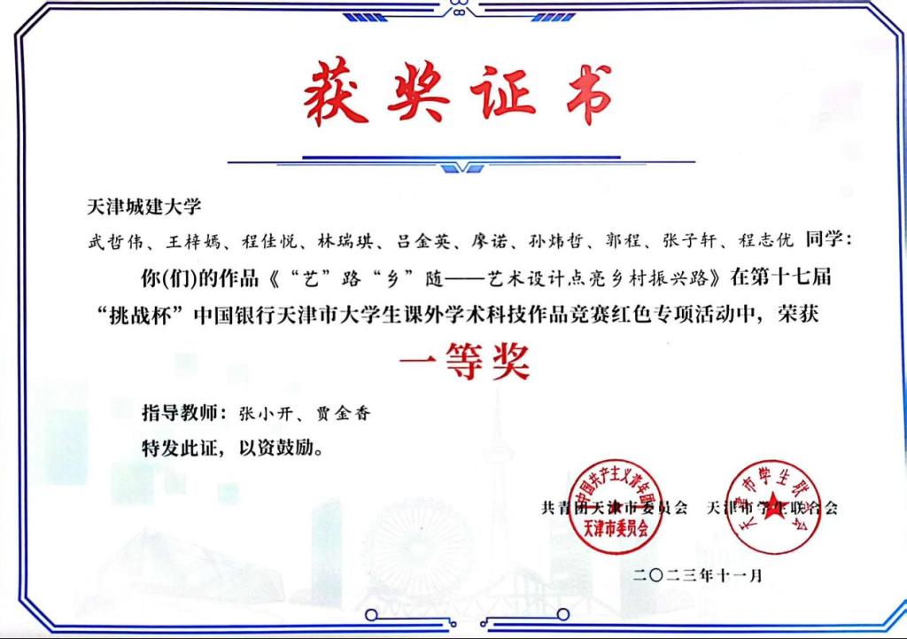 近日,团市委对第十七届“挑战杯”中国银行天津市老员工课外学术科技作品竞赛红色专项活动竞赛结果进行通报,经过校级初赛选拔,33所公司的807个项目入围市级复赛,经过评审委员会评定,共评出获奖作品172项,其中特等奖18项,一等奖37项,二等奖47项,三等奖70项。公司教师指导武哲伟等10名员工参赛的《“艺”路“乡”随——艺术设计点亮乡村振兴路》项目获得一等奖,在“挑战杯”课外学术科技作品竞赛红色专项活动中取得巨大突破,同时也是公司唯一获奖的项目。