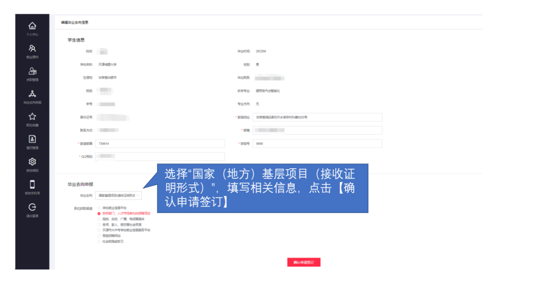 2.选择毕业去向,选择“国家(地方)基层项目(接收证明形式)”,选择“职位获取渠道”,确认无误点击【确认申请签订】;