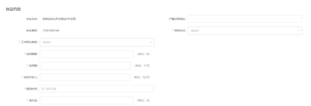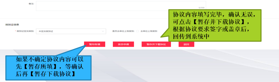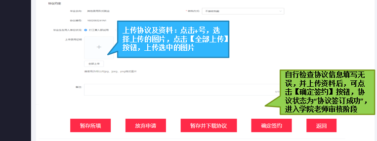 3.与单位沟通后,填写员工、单位双方约定信息,此时不需要上传协议照片,选择报到证签发类别,协议内容填写完毕,确认无误,可点击【暂存并下载协议】;