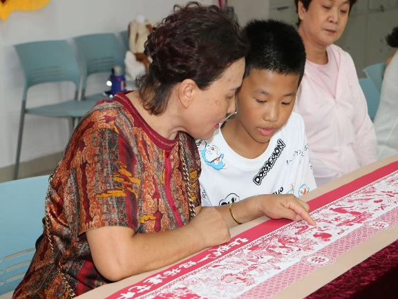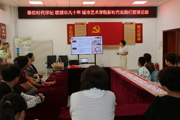 宣讲团成员带领社区居民们近距离欣赏绘制的非凡十年历史长卷,为其讲解长卷中发生的历史事件、对应时间节点以及代表性建筑。宣讲结束后,宣讲团成员组织群众共同进行红色剪纸游戏,寻找图形在长卷中对应的位置。