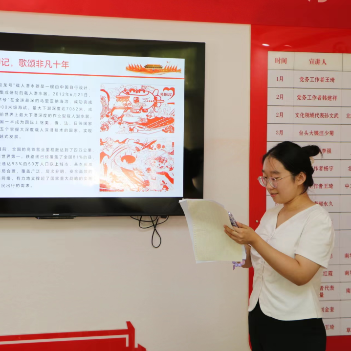8月31日下午,宣讲团来到了台头镇党史纪念馆。纪念馆位于天津市静海区台头镇的中二堡村,中二堡村村委会负责人带着宣讲团成员参观党史纪念馆,便领着人们走进紧挨着党史纪念馆的“宣讲团活动室”。活动室的屏幕中播放着宣讲视频,群众们在此聆听宣讲员讲述过去十年祖国的伟大成就。