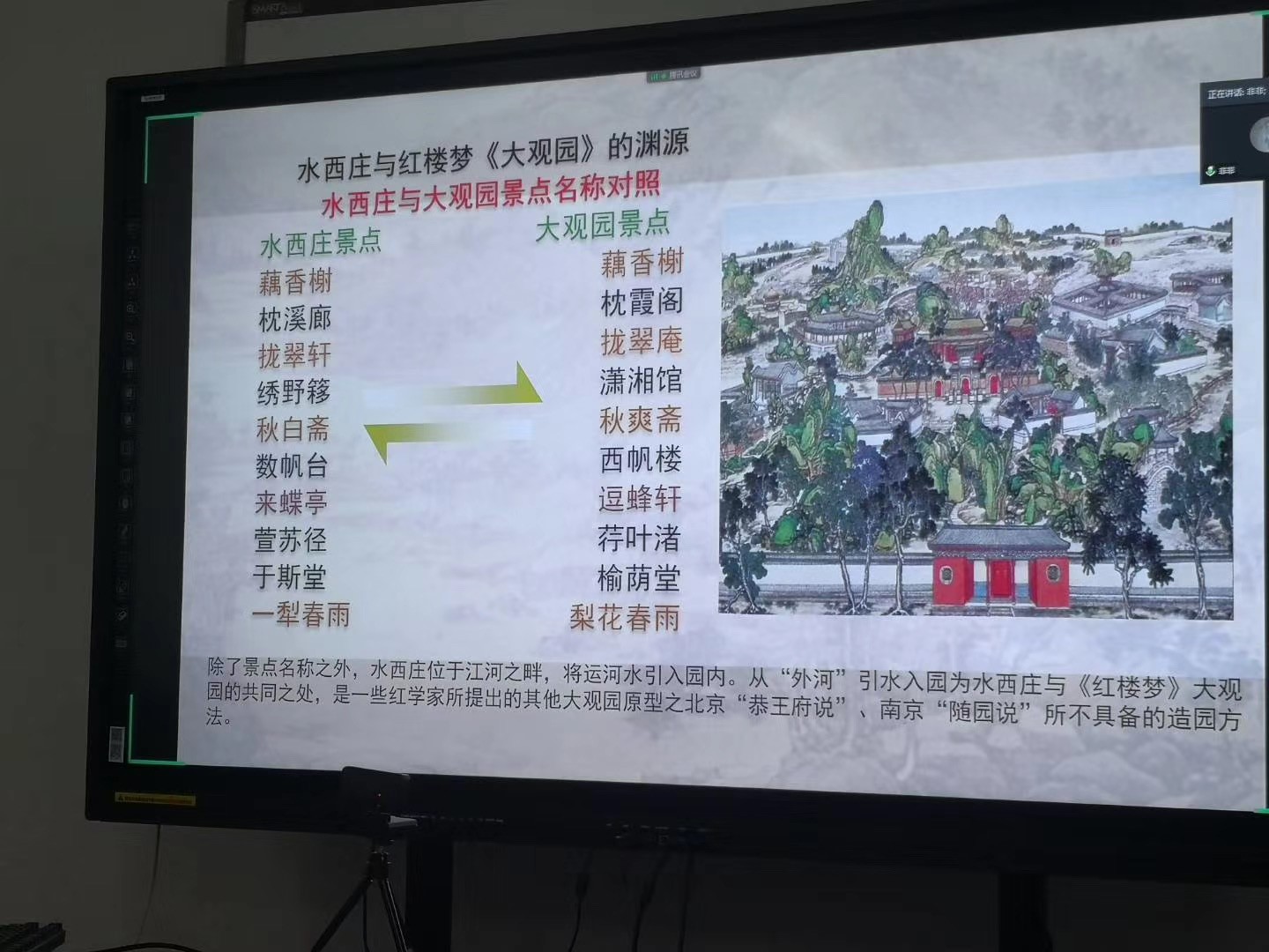 最后,席老师以园林视角对水西庄即为红楼梦中大观园之原型的论断进行考证分析。主要是对揽翠轩,数帆台、赏月区、一犁春雨和花影庵的命名进行类比解析。