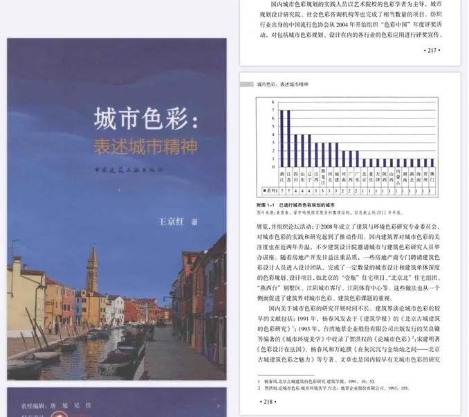 在大量感性图片视频讲解后,灵活解决运用逻辑思维加以整理,提炼自我学术认知和表达等问题,特意选取王京红老师的《城市色彩-表述城市精神》作为本课程阅读教材。本书不仅描述了色彩分析的复杂性、多样性和其应用范围,还对了解城市色彩在国内外研究现状、克服“千城一面”、“色彩污染”和找寻城市精神的表述,都具现实价值,此外,对本课程的结课论文撰写具有现实指导意义。