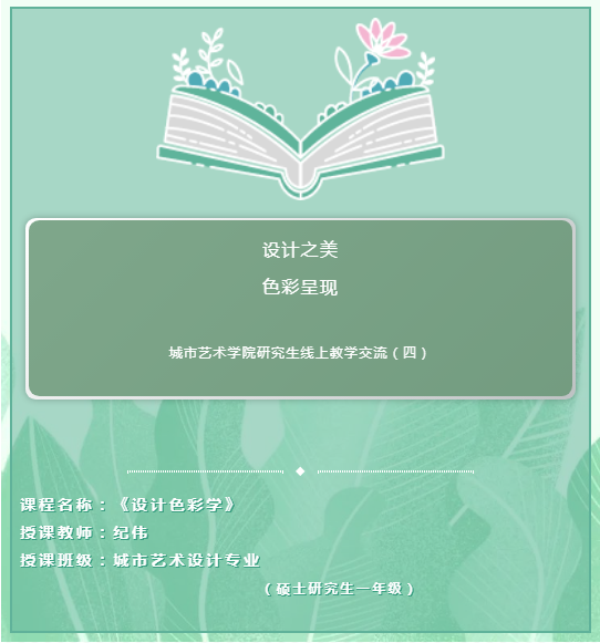 纪伟教授是tyc122cc太阳成研究生学位课程《设计色彩学》的授课教师,同时也是公司环境艺术设计研究方向的硕士生导师。纪伟老师在教学实践中结合自身的专业认知和课程要求,以鲜活的城市案例作为课程开篇,引导研究生们开阔视野、总结经验。期间以自身学术积淀为母体,有针对性地提取发表过的论文论著反哺研究生教学实践,结合“立德树人”的总要求,适时引用思政元素。在短短的八周教学时光中,师生情长,学术并肩。本期推出纪老师线上教学体悟——《设计之美,色彩呈现》。