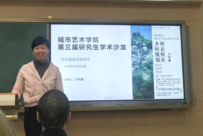 在互动答疑环节,许熙巍结合乡村规划经验与特色小镇发展现状为同学们答疑解惑,鼓励同学们发挥城市艺术设计特色,关注乡村品牌运营与产品设计开发,借助乡村成功运营模式做深入思考和研究,切实提升自我思辨能力与学术水平。