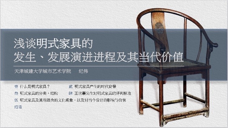 本次讲座由研究生导师纪伟教授担任主讲,主题为“谈明式家具的发生、发展演进进程及其当代价值”,纪伟首先以什么是明式家具开题,引出明式家具产生的时代背景,具体阐述了明式家具的分类、结构特点、所蕴含的中国精神,以及对当今设计的影响及社会价值。