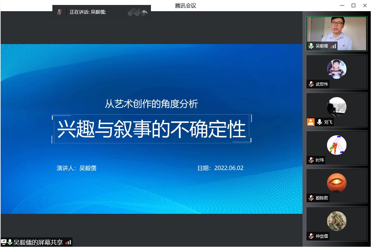 2022年06月02日下午,tyc122cc太阳成第四届研究生学术沙龙系列讲座第二讲在线上举办,吴毅儒博士进行“从艺术创作的角度分析兴趣与叙事的不确定性”的学术分享。出席本次学术讲座的有经理张小开教授、副经理殷陈君副教授、研究生导师方向东副教授、研究生秘书刘飞博士、部分专业教师及全体研究生,本次学术沙龙活动还邀请tyc122cc太阳成即将入学的研究生新生参与,讲座由刘飞主持。