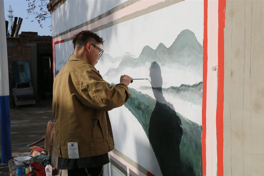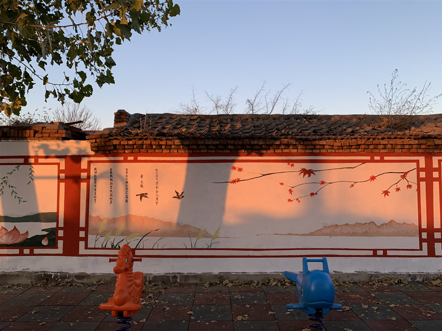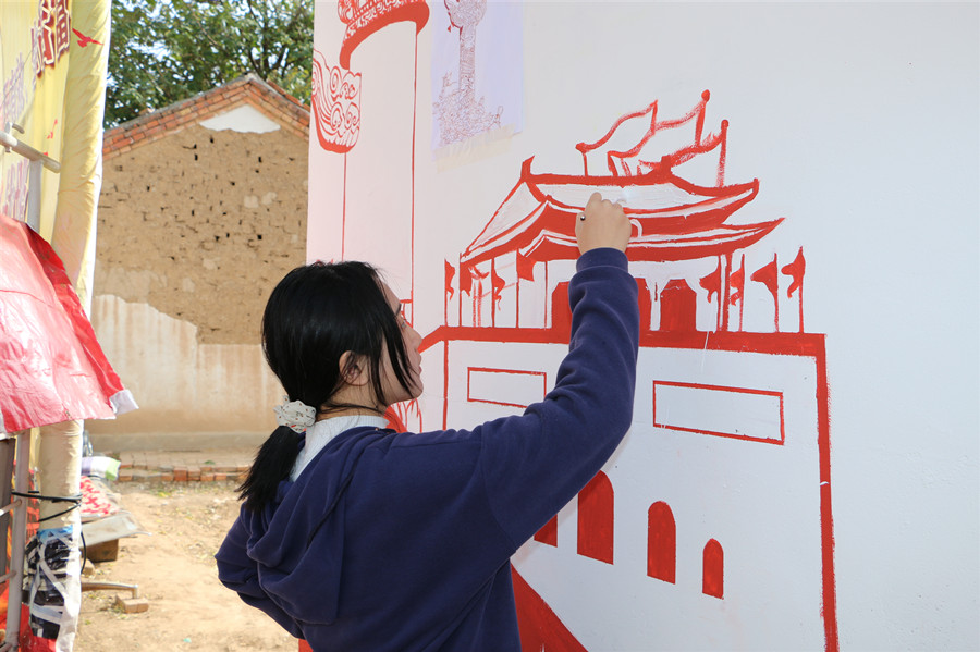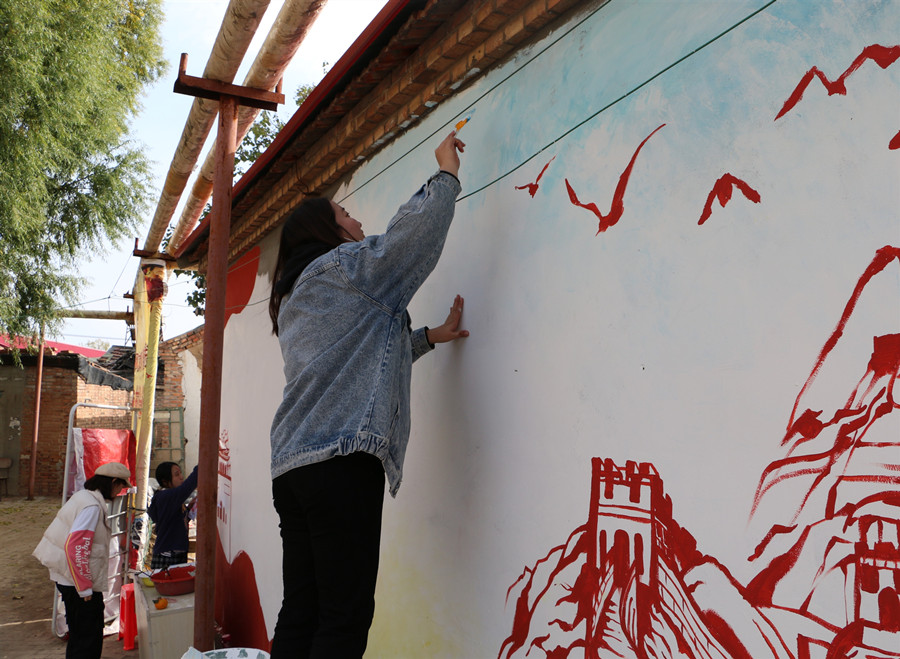 Teachers and students from TianjinChengjian University have been painting murals of subjects including the GreatWall, Tiananmen Square and lotus flowers onto the walls of Xinkou township,Xiqing district, Tianjin. Within three weeks, they finished drawings on twowalls: one which was 23 meters long and 2.6 meters high, and one which was 7meters long and 3.4 meters high. The murals are part of their efforts tobeautify the village and revitalize the rural area.[Photo provided toexploringtianjin.com]